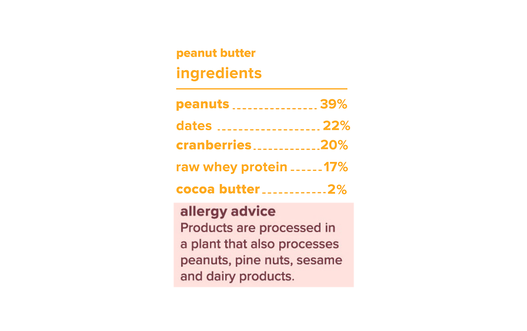 Peanuts (39%), Dates (22%), Cranberries (20%), Raw Whey Protein (17%), Cocoa Butter (2%)