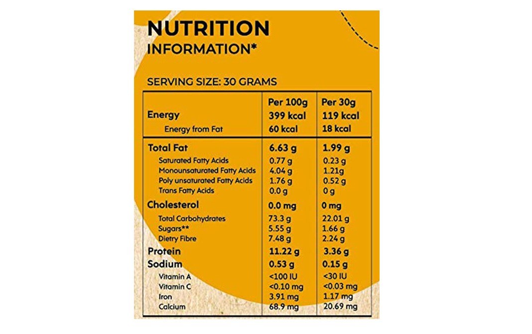 Extruded Quinoa Flakes (28%), Extruded Millets Flakes (7%), Rolled Oats (20%), Wheat Flakes (3%), Brown Rice Flakes (5%), Corn Flakes (8%), Raisin (7%), Almond (8%), Honey (5%), Sugar (7%).