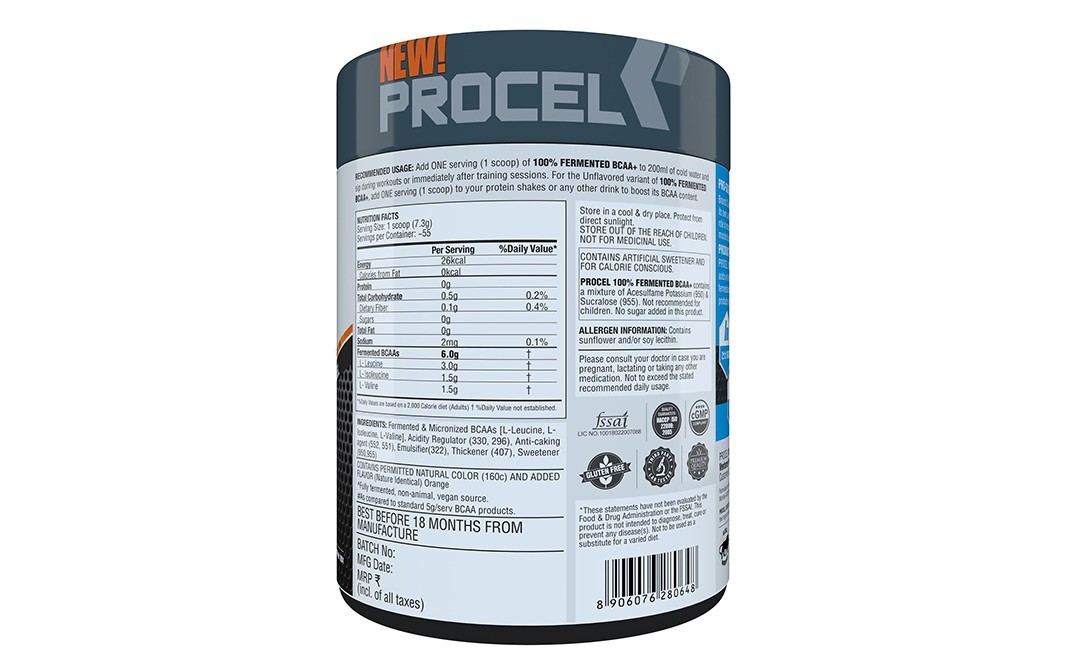 Fermented & Micronized BCAAs [L-Leucine, L-Isoleucine, L-Valine] Contains Permitted Natural Colour (160c) and Added Flavour (Natural Identical) Orange